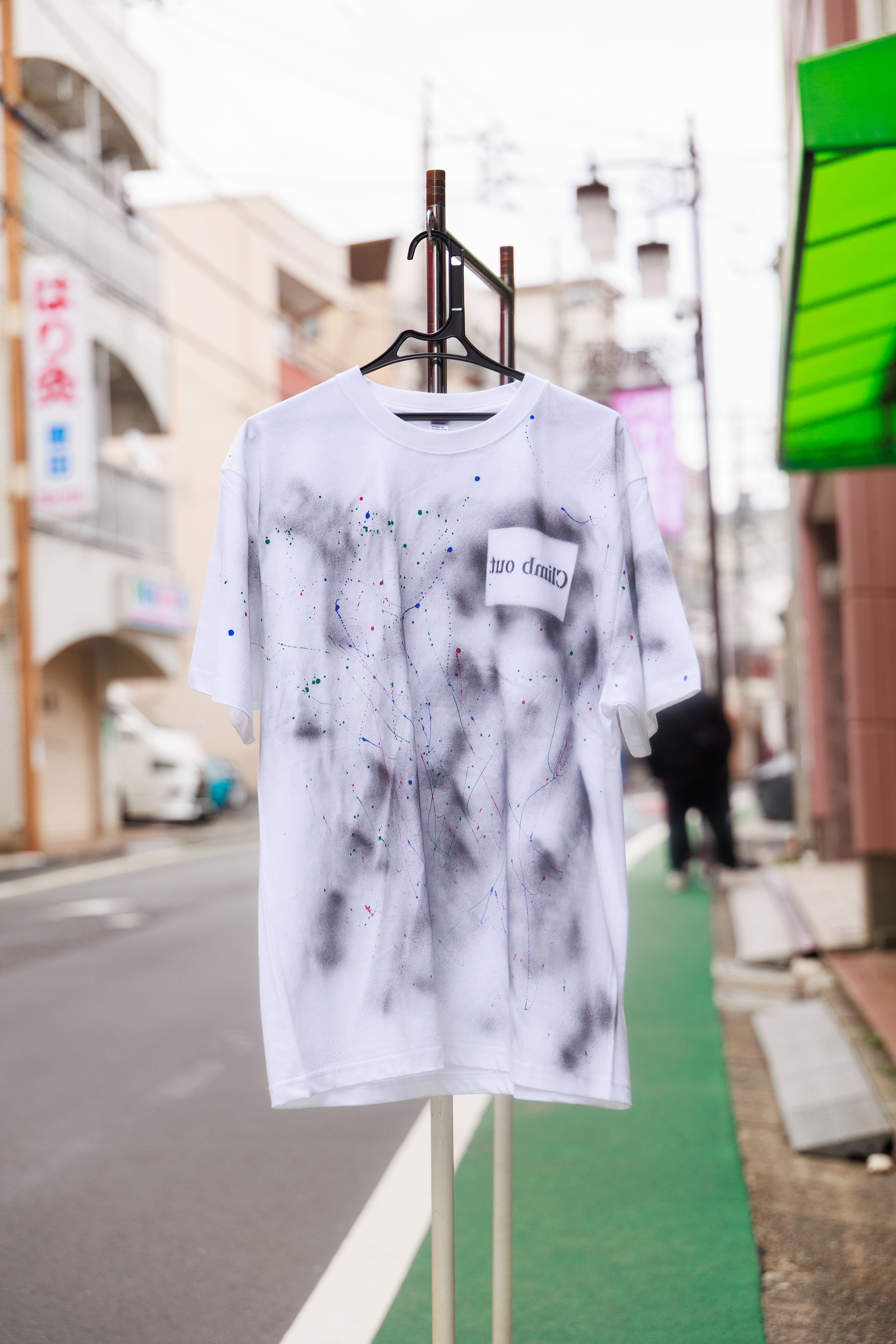 「Climb out」の文字が「左右反転(鏡文字)」になっているため、鏡の前に立った時、初めてそのメッセージは正しい向きであなたに語りかけます。それは「這い上がるために打ち勝つべき本当の敵は、鏡に映る自分自身である」という、深くエモーショナルなメッセージの表れです。 ホワイトボディ全体に立ち込める黒いスプレーの斑模様は、心の内の葛藤やノイズを表現。そこにレッド、ブルー、グリーンの鮮やかなスプラッターペイントが、熱い血潮や感情の起伏のように散りばめられています。